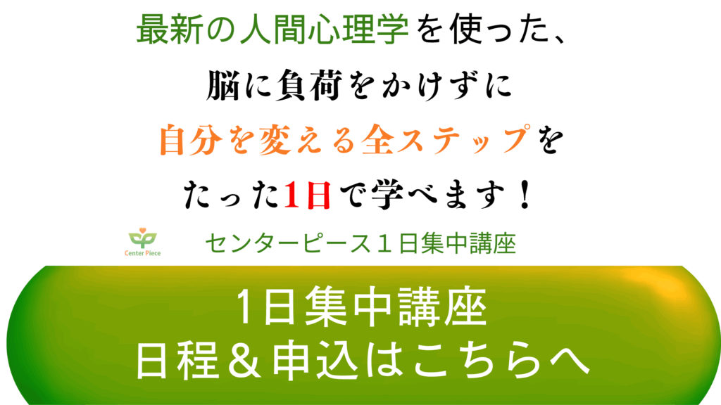 | 内容 | センターピースを1日に体験できる「1日集中講座」6ヶ月間のエッセンスがギュッと凝縮されており、幸せに成功する過程を実際に体験できる講座です。 |