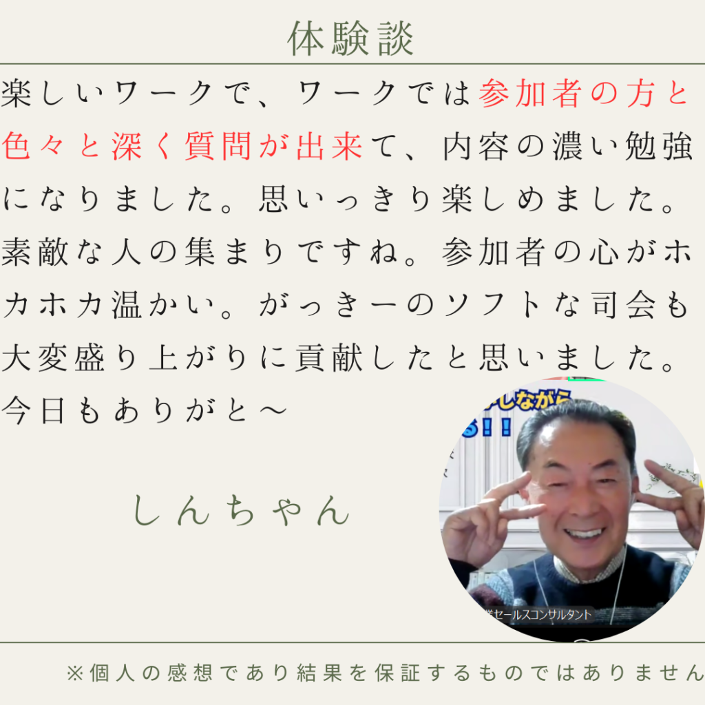 学んでいると、どんどん周りの人が優しく感じるようになり、楽しいことも増えてきました。顧客との関係も楽になって、さらに行動しやすくなってきました。気が付くともう7年です(笑)